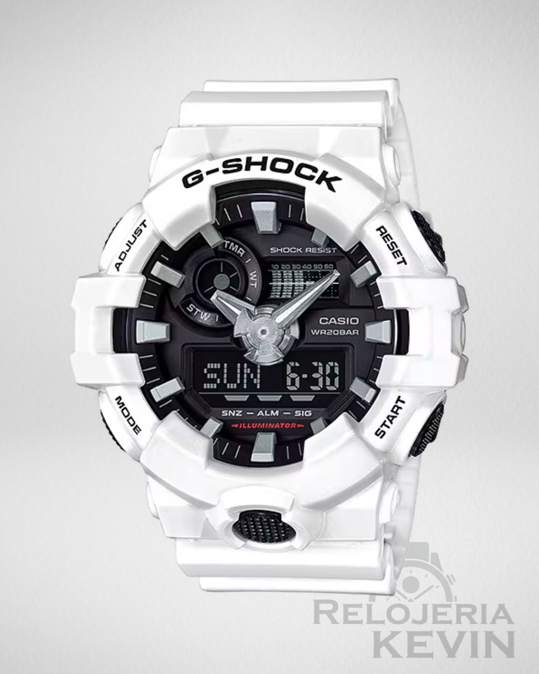 El Casio GA-700-7A es un reloj de la icónica serie G-SHOCK, diseñado para ofrecer durabilidad extrema, funcionalidad avanzada y un diseño moderno. Su caja y correa en blanco mate con detalles en negro crean un contraste llamativo y versátil, perfecto para quienes buscan un accesorio resistente con estilo urbano.