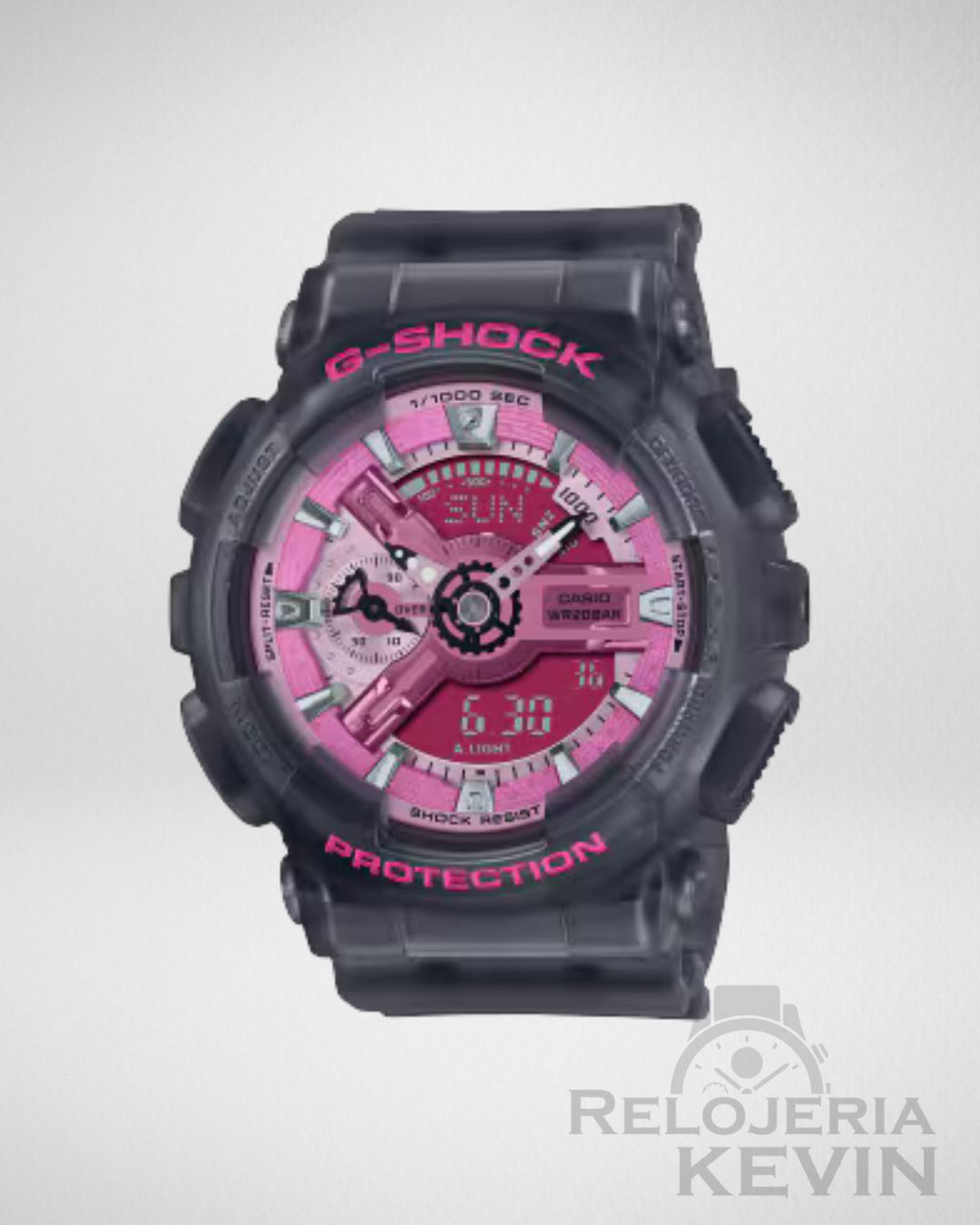 El Casio GMA-S110NP-8A es un reloj análogo-digital para dama que combina un diseño moderno con funcionalidades avanzadas. Su caja y correa de resina semitransparente en tono gris, junto con detalles en rosa brillante en la esfera, le confieren un estilo distintivo y contemporáneo.