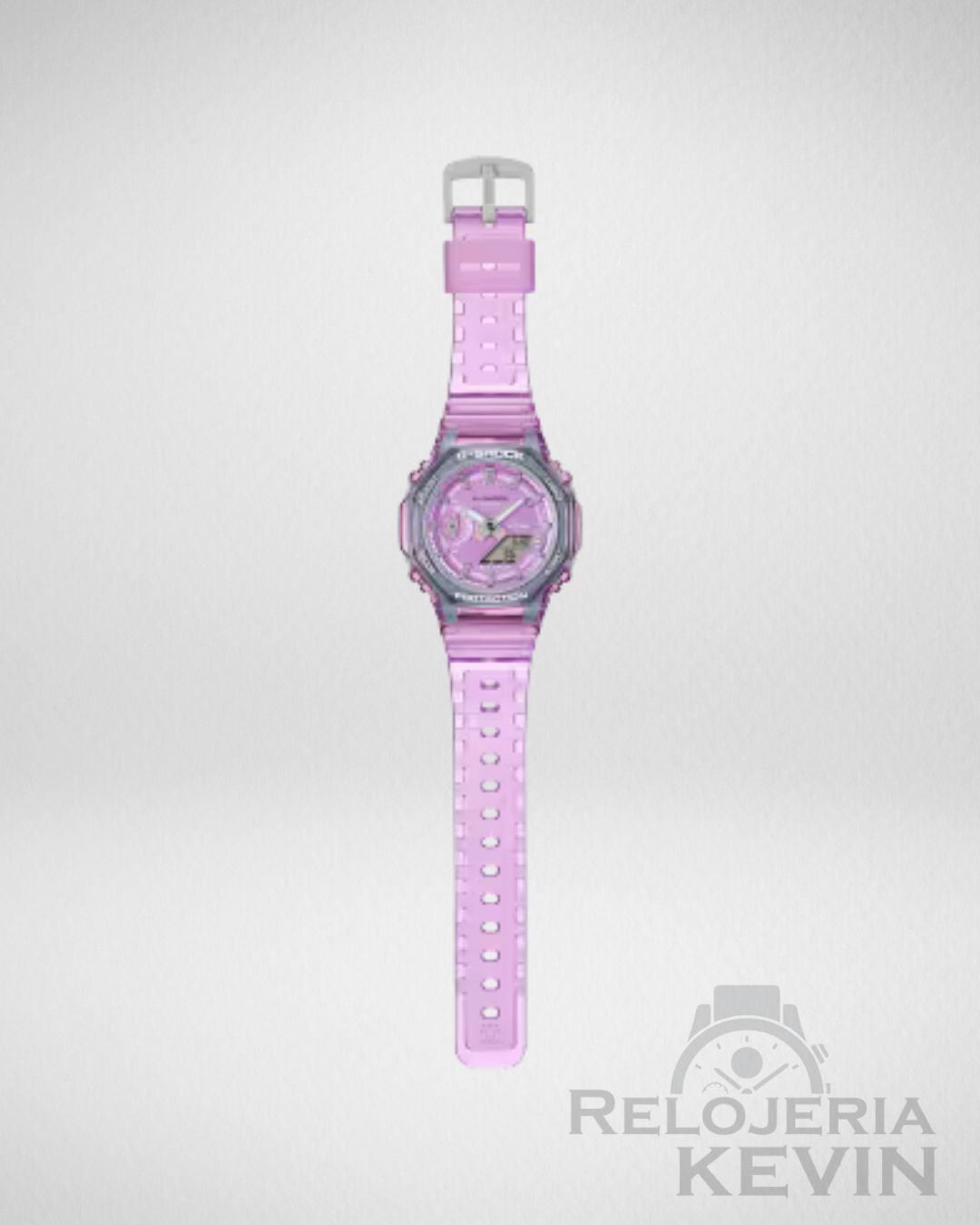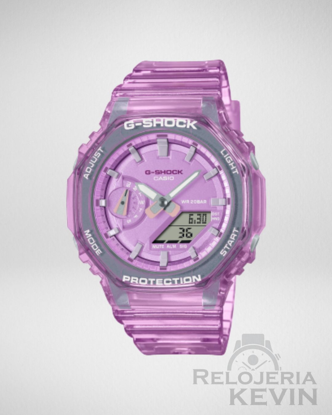 El Casio GMA-S2100SK-4A es un reloj análogo-digital para dama que combina un diseño moderno y funcionalidad avanzada en un formato compacto. Su caja octogonal y correa de resina translúcida en tono rosa le confieren un aspecto distintivo y elegante, perfecto para complementar cualquier atuendo.