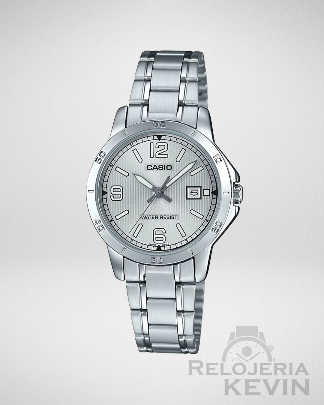 El Casio LTP-V004D-7B2 es un reloj análogo para dama que combina elegancia y funcionalidad en un diseño clásico y sofisticado. Su esfera plateada con detalles en tono plateado y correa de acero inoxidable lo convierten en el accesorio perfecto para cualquier ocasión.