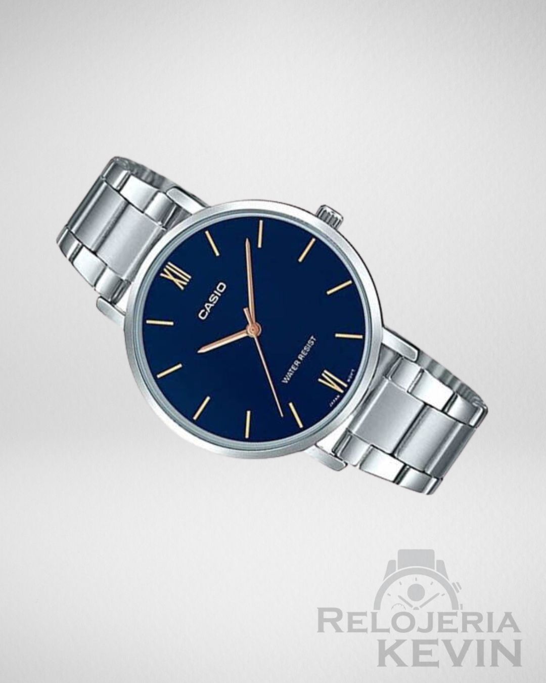 El Casio LTP-VT01D-2B2 es un reloj análogo para dama que combina elegancia y funcionalidad en un diseño moderno y sofisticado. Su esfera azul profundo con detalles en dorado y correa de acero inoxidable plateada lo convierten en el accesorio perfecto para cualquier ocasión.