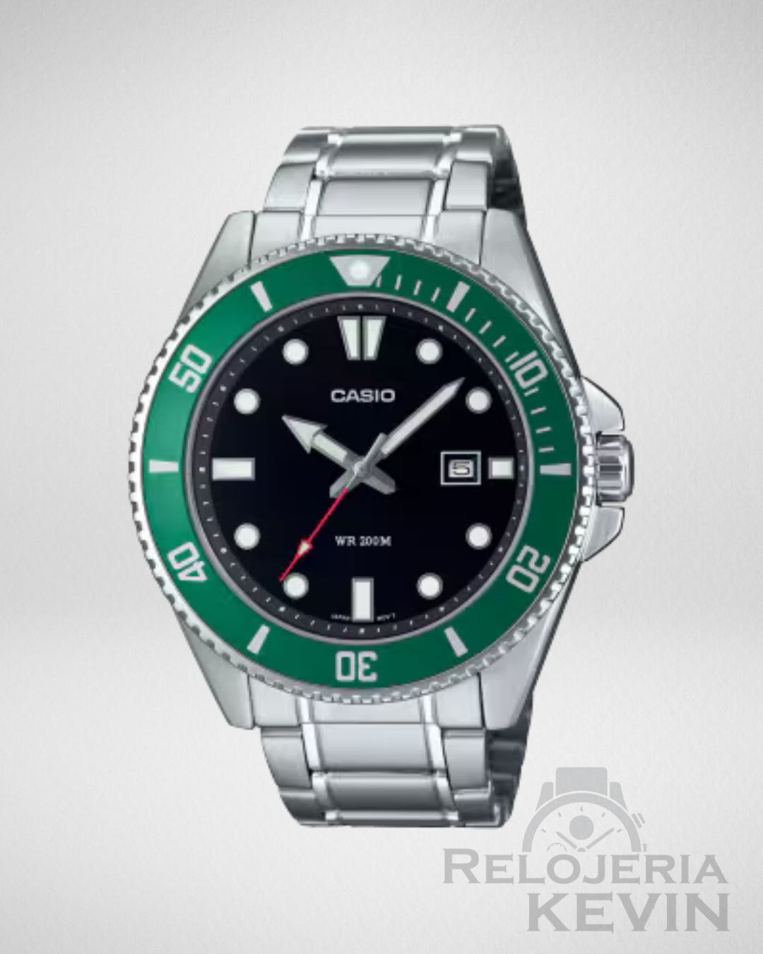 El Casio MDV-107D-3AV es un reloj diseñado para los amantes del océano y la aventura. Con una resistencia al agua de 200 metros, este modelo es perfecto para nadadores, buceadores recreativos y aquellos que buscan un reloj duradero y elegante. Su llamativa esfera verde con detalles en blanco y plateado le da un toque moderno y sofisticado, ideal tanto para el agua como para el uso diario.
