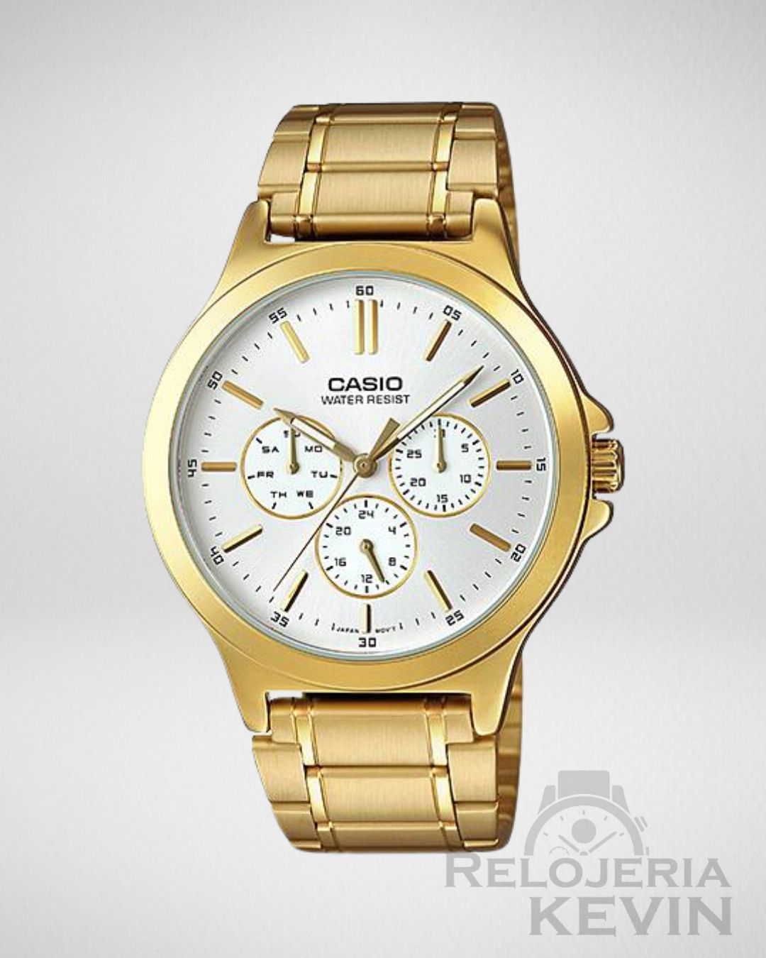 El Casio MTP-V300G-7A es la opción perfecta para quienes buscan un reloj con un diseño sofisticado y funcional. Su acabado completamente dorado le otorga un estilo elegante y lujoso, mientras que su esfera blanca con detalles dorados proporciona un contraste refinado y una lectura clara del tiempo. Este modelo es ideal para ocasiones formales o para quienes desean destacar con un accesorio de alta presencia.