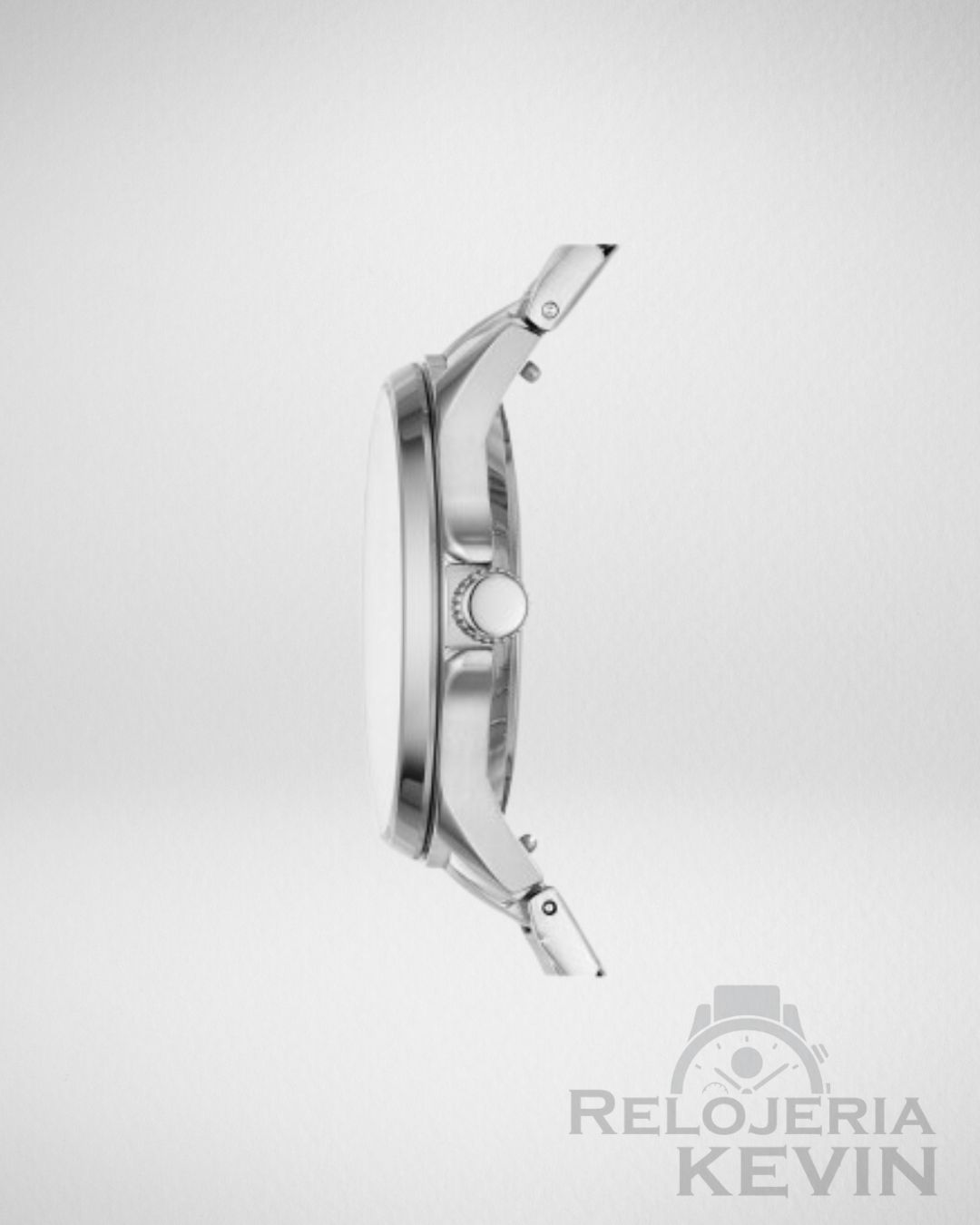 Brazalete de acero inoxidable plateado: De 18 mm de ancho, complementa el diseño general y se ajusta de forma segura con un cierre desplegable de dos pulsadores.