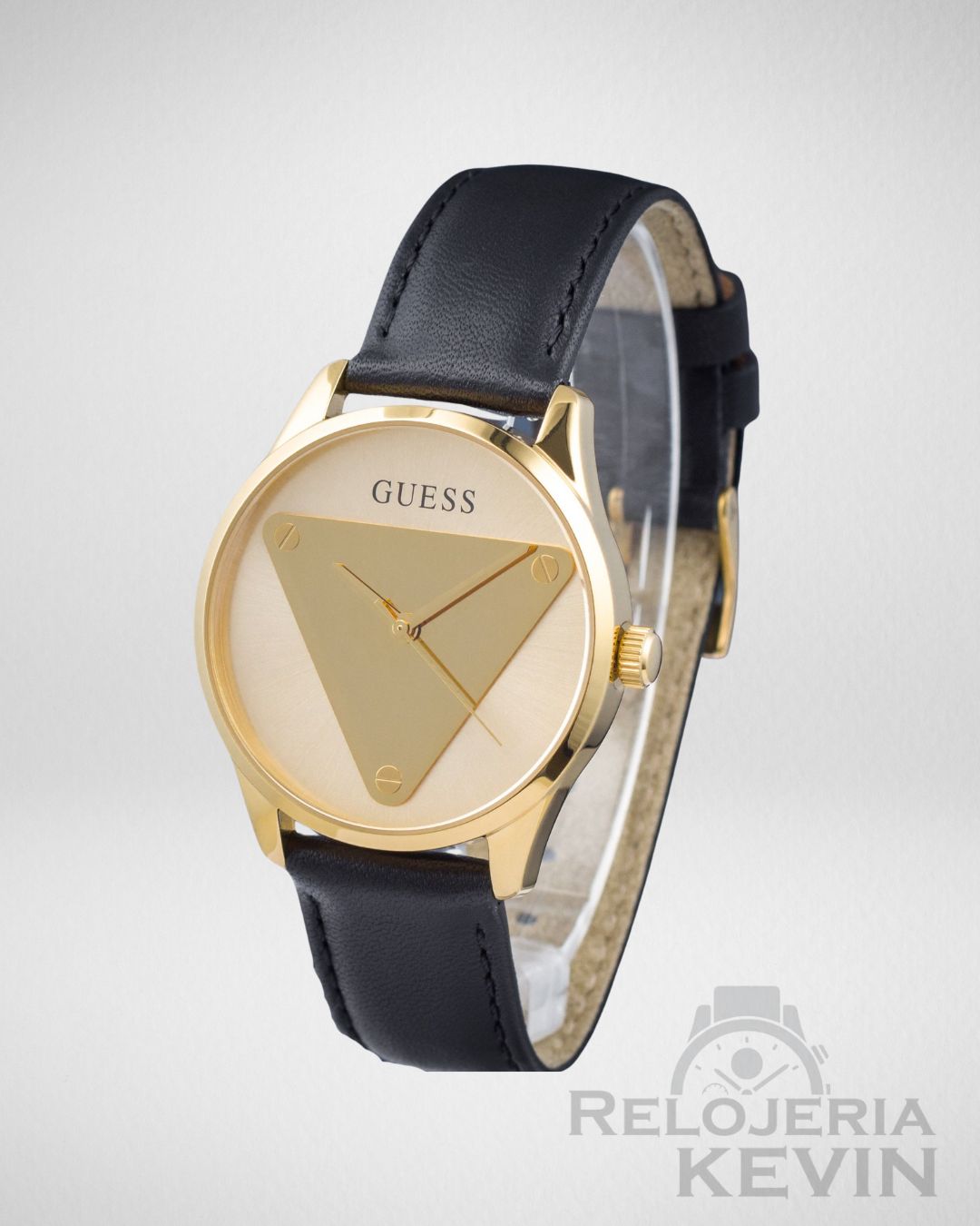 Diseño distintivo: La esfera dorada presenta el emblemático triángulo en relieve de Guess con detalles de tornillos, aportando un toque sofisticado y reconocible.