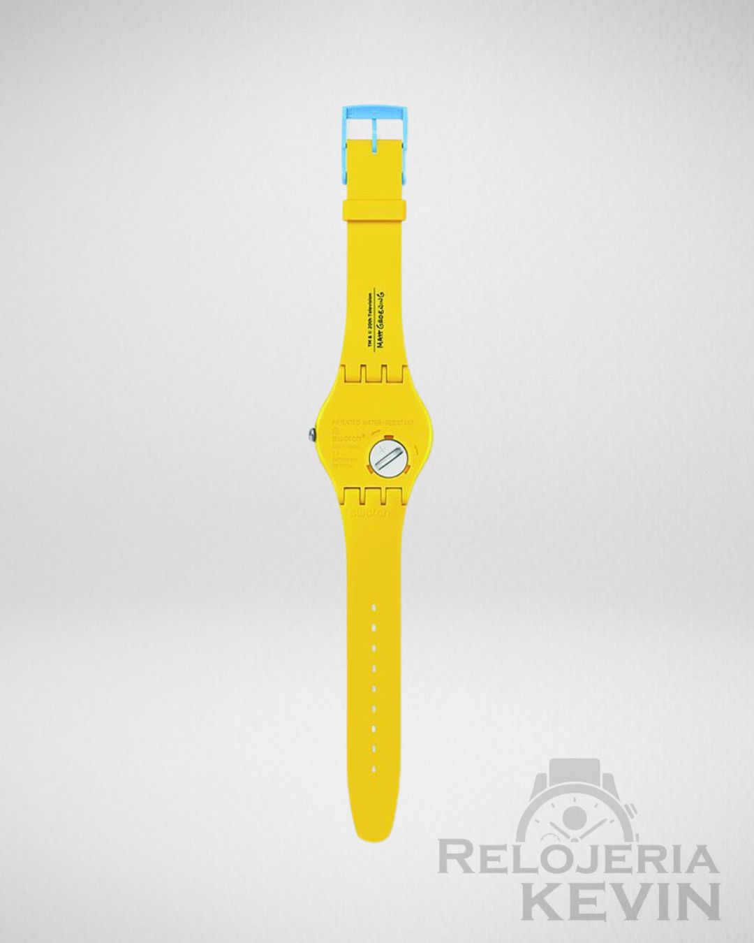 El Swatch SO29Z134, parte de la colaboración con Los Simpson, es un reloj que combina diseño lúdico y materiales sostenibles. Inspirado en el amor de Homero Simpson por los donuts, presenta una esfera amarilla con la imagen de un donut mordido y una correa que simula un donut glaseado con chispas de chocolate.